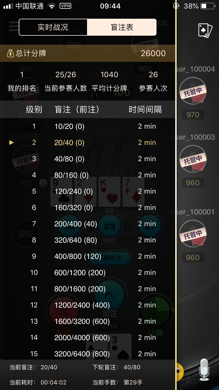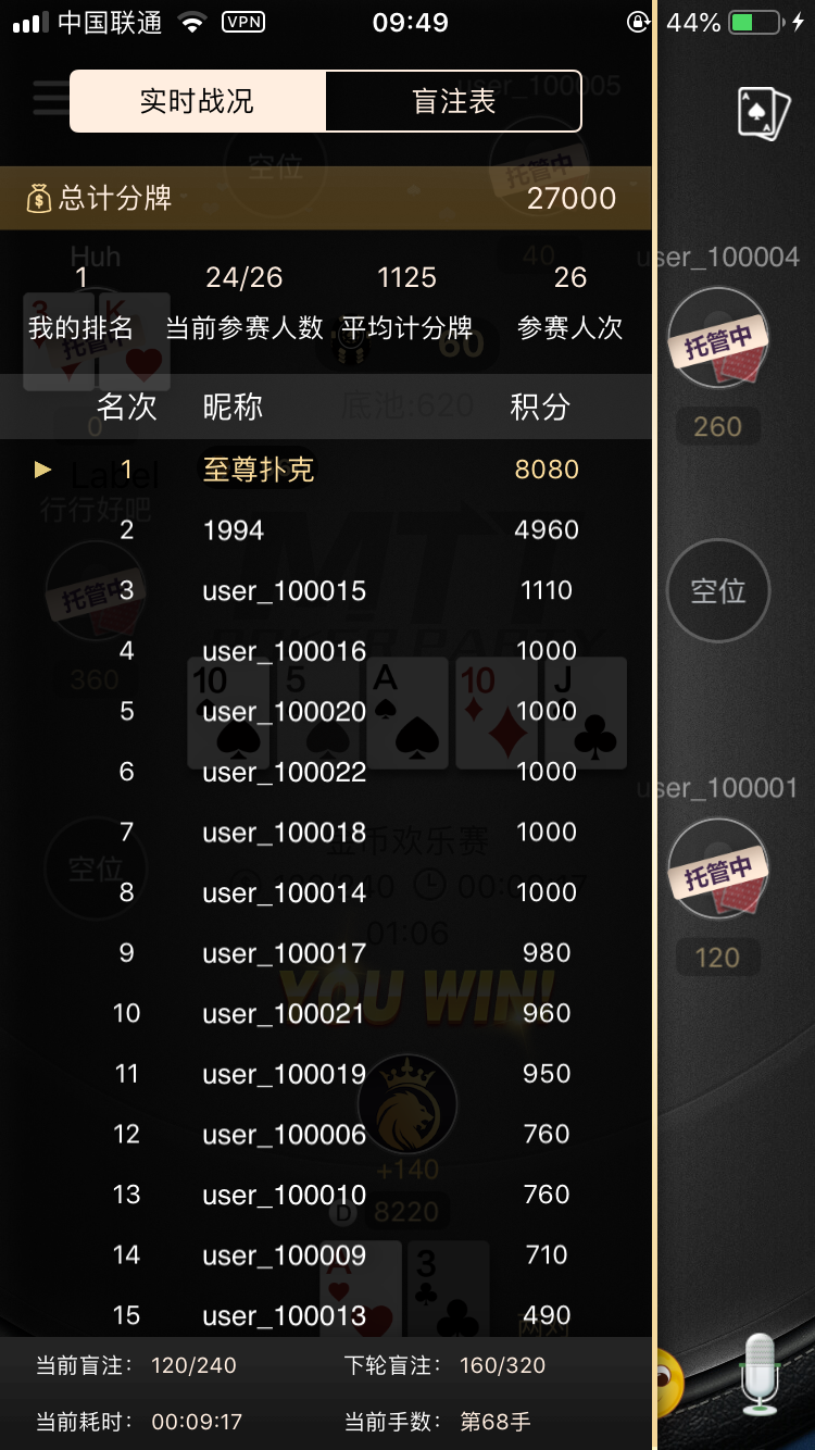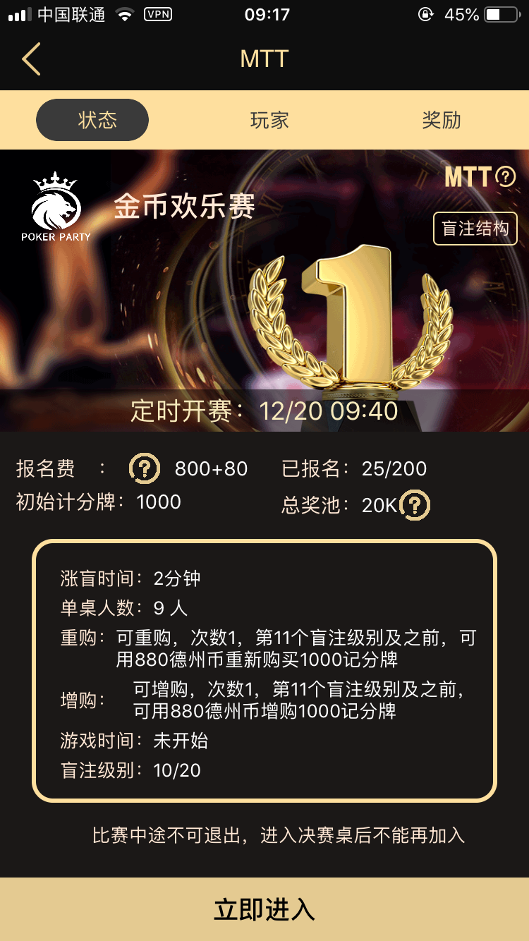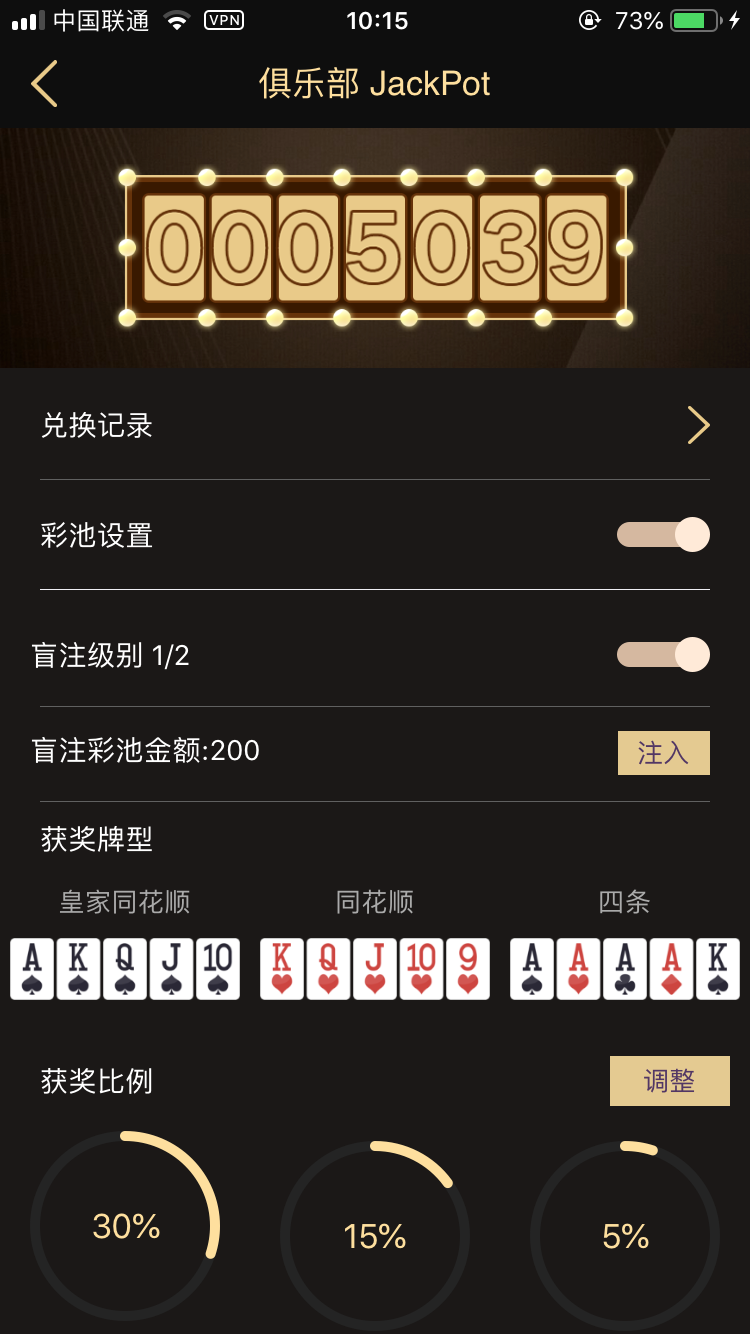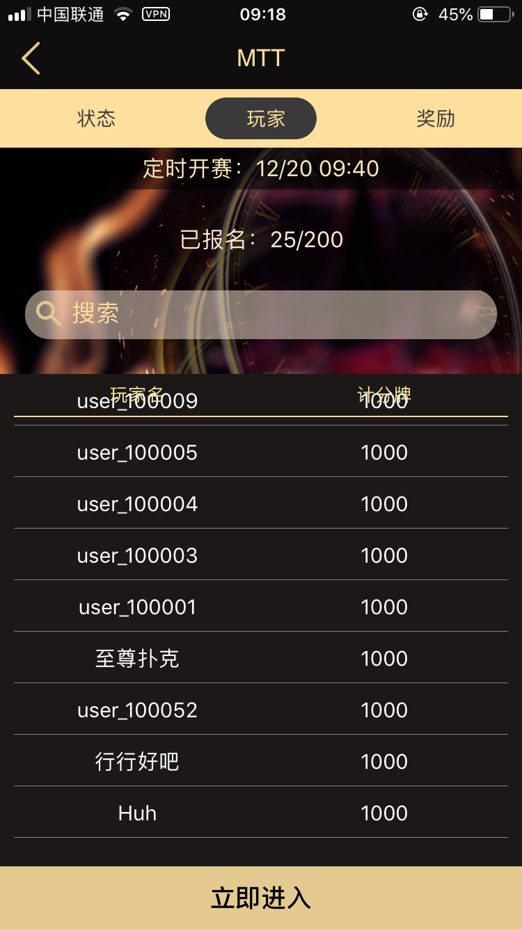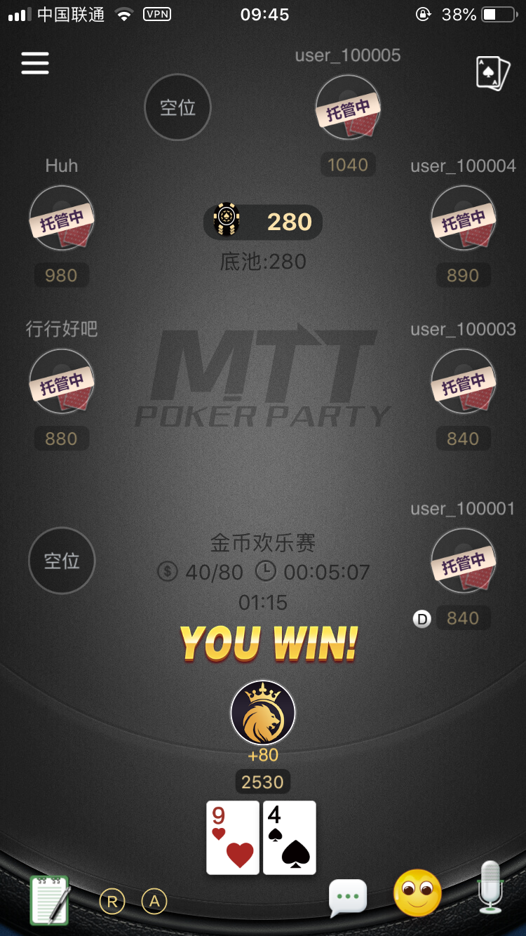 全新比赛模式,坐满即玩;SNG 设置人数档位分别为 2个 6个 9个,不同人数自动分配不同的报名费;由于SNG玩法的不同,设置中添加了涨盲时间和买入设置。其他的还有跟一般局一样的通用设置 带入控制、GPS限制、IP控制等。