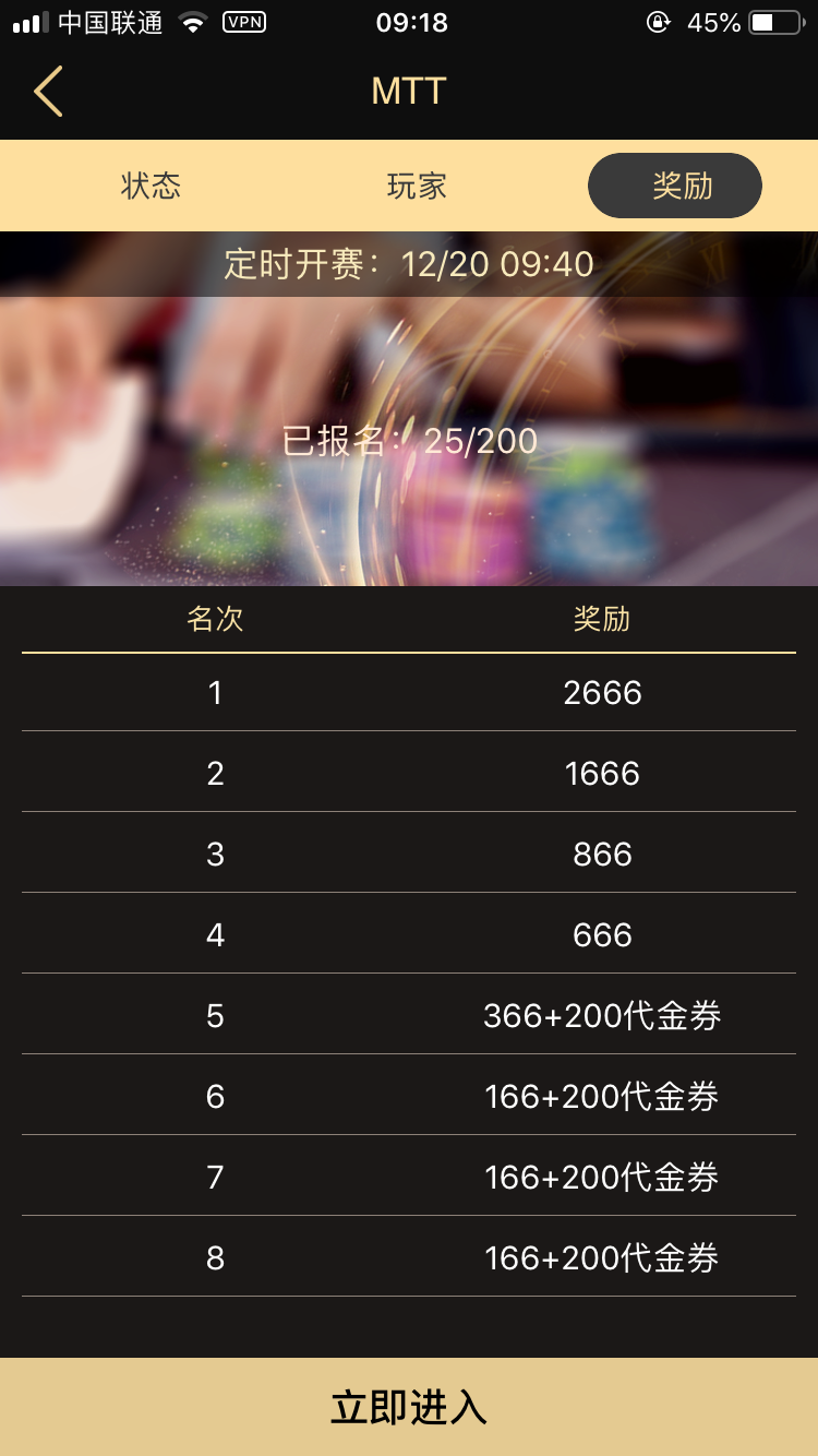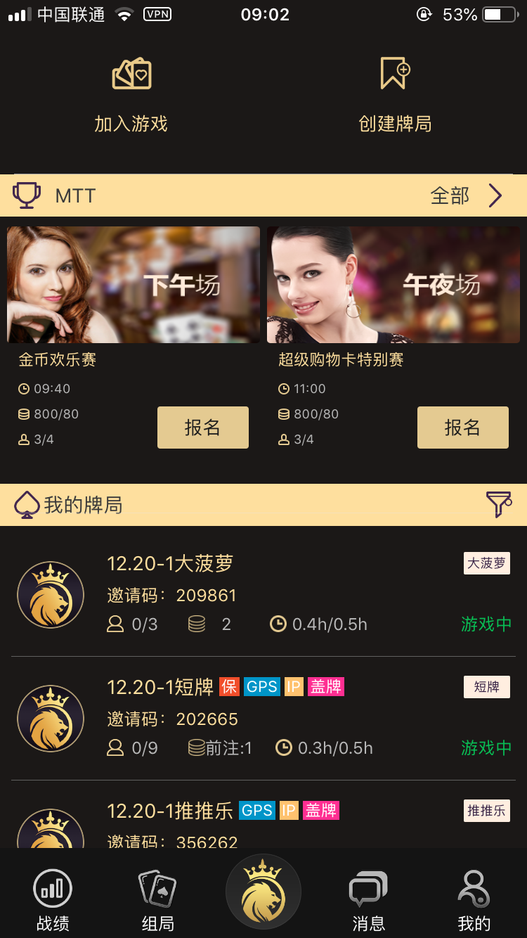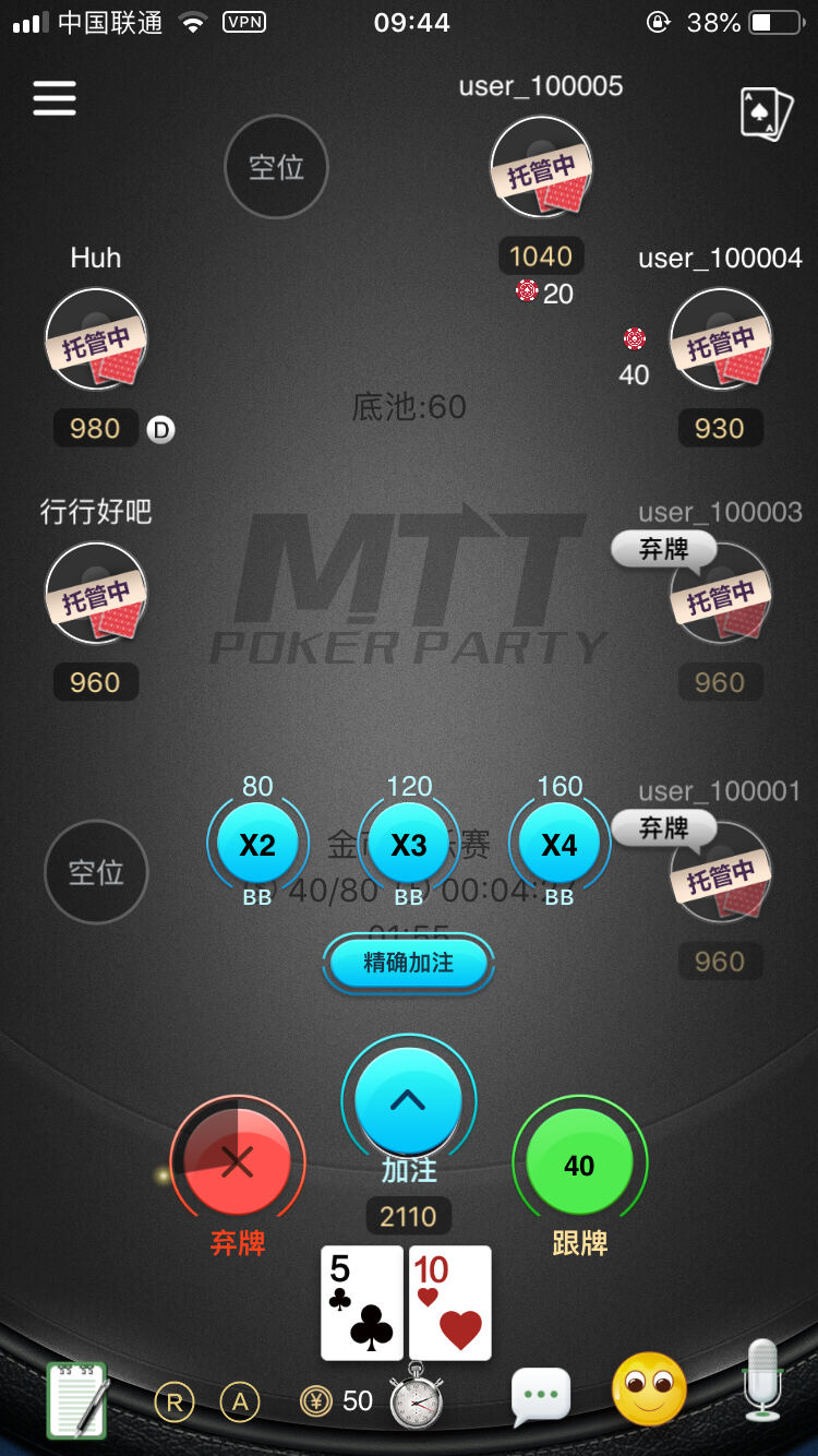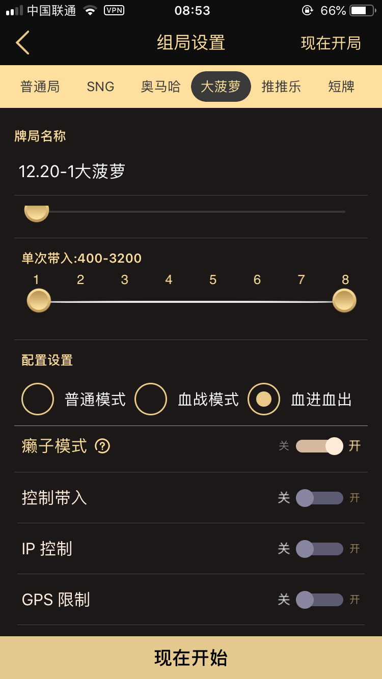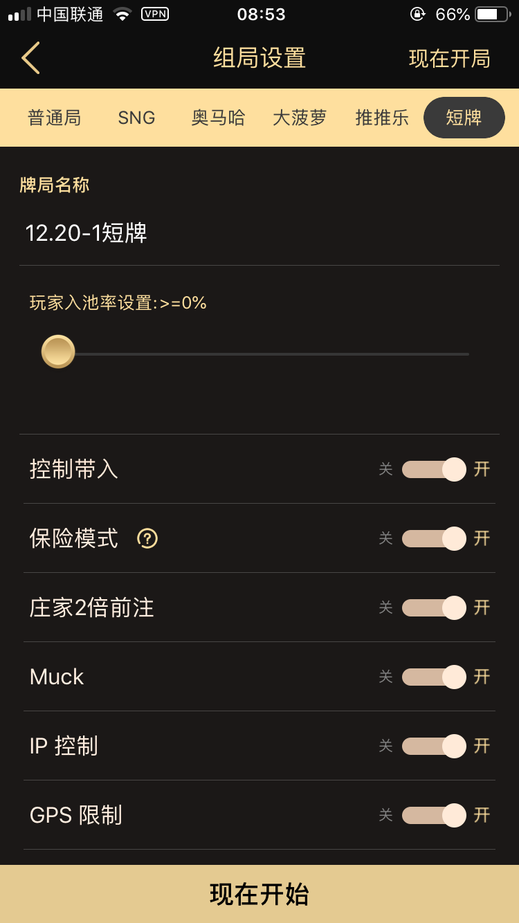 目前共有五种牌局供玩家选择,分别是:普通局、SNG、奥马哈、大菠萝和推推乐;对应不同局有相应的区别设置。