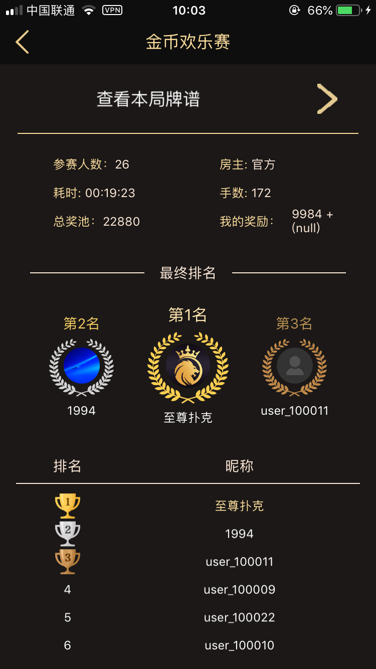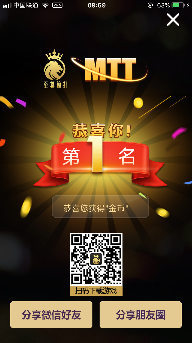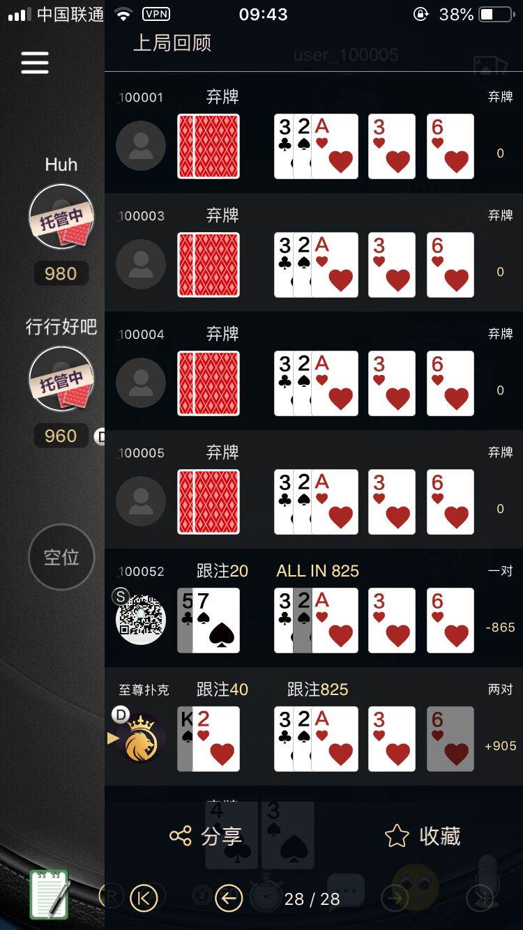 在结束一局牌局后可以通过收藏功能对该局进行收藏,在收藏后可查看回放和通过微信等分享牌局的精彩时刻