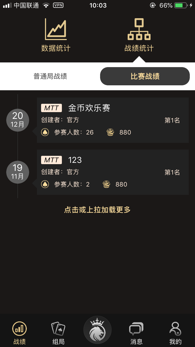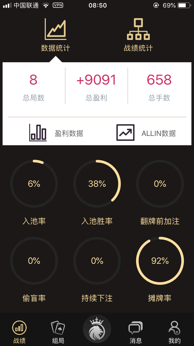 在战绩中可以看到数据统计,可通过统计看到盈利情况和胜率等;还可以看到战绩统计,可以查看战绩历史和牌局情况;通过这两项功能可查看个人的对战情况,以便于提升和分析