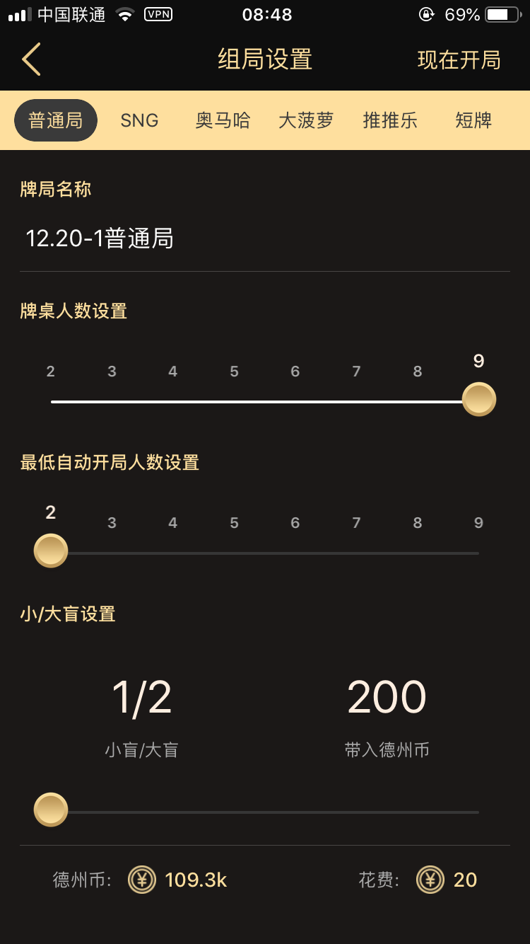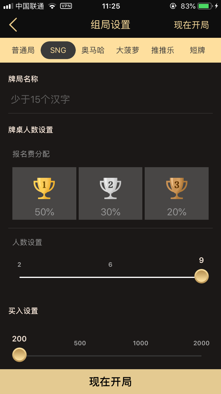 组局中可以选择普通牌局、SNG或奥马哈,可以设置房间名字、牌桌人数、大小盲、带入金币和牌局时长等等