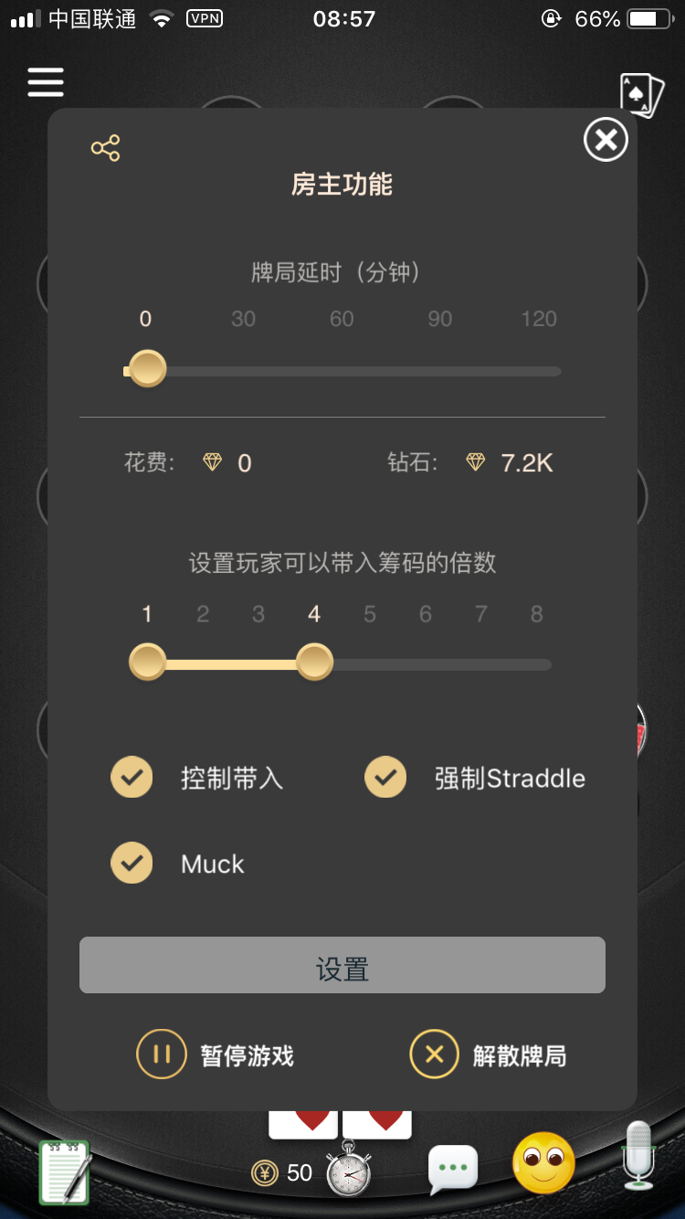 奥马哈的设置大概跟普通局的差不多,可以设置2到9个玩家人数、大小盲的大小和带入的金币额;值得注意的是 高级设置,在高级设置中您可以设置牌局时长、最短的上桌时间(预防赢了就走)、带入的倍数、新颖的玩法Straddle还有 GPS限制、IP控制等。